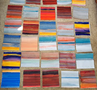 At the moment I am focussing on work towards an exhibition at the end of August called 100 Square Feet. The Gallery has 100 artists participating, each artist has the challenge of making 101 pieces of art work, one piece from each, being shared amongst the artists. The 15x15cm works placed into 100 square boxes and given to each artist at the end of the show.... the 101st piece of work then being auctioned the proceeds going to charity ...Along with the 101 art works, each artist is also allotted a square block of wood, with which to create an art work for the exhibition this has to be completed by mid August....I am thinking of ideas for this at the moment...I have been working on my 101 pieces just completed today...the last 30 were a struggle to say the least! For these works I recycled old art works from College cutting them into 15x15cm pieces and reworked them, adding colour and lines of gold leaf...I had a struggled to know what to name the work threads...gold threads ...lines 3 lines...then thought of Altered Images, simply because that's what they are -here's a few images of the works....